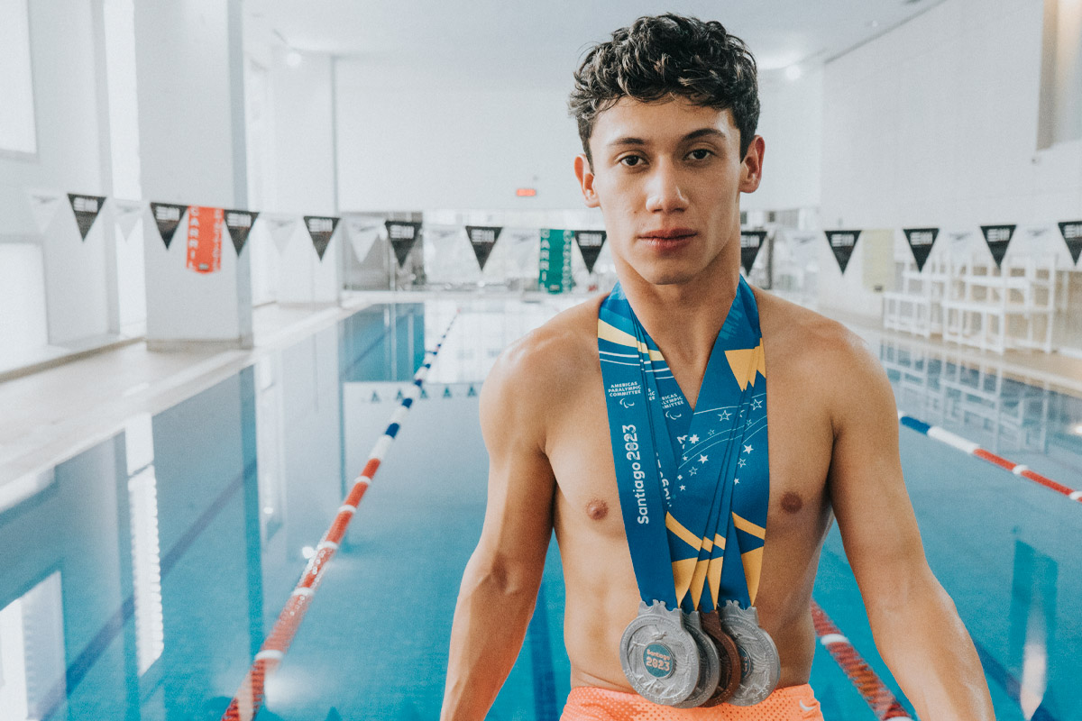 “La natación llegó a mi vida por medio de una recomendación médica”, relata. “Mi discapacidad es una parálisis cerebral y es el único deporte que me ayuda a mantener mi cuerpo en buen estado”. En ese momento, Marcos tenía 11 años y no se imaginaba que un día llegaría al más alto nivel en esta disciplina. “No tenía el don de nadar, me costó mucho trabajo agarrarle amor a las competencias, sin embargo, ya cuando logro ganar mis primeras medallas de oro a nivel nacional es cuando me doy cuenta de que tengo potencial para esta carrera”. Aunque comenzaba a sentirse más cómodo en la alberca, no todo resultó fácil a partir de entonces y el momento más complicado para él fue quedar fuera de los Juegos Paralímpicos de Tokio: “Llegué a odiar la alberca un tiempo. Levantarme para trabajar de cara a los Juegos de París, que era un ciclo de tres años, fue bastante complicado”.